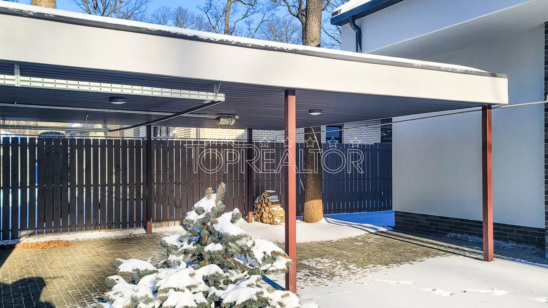 Имеется навес на два автомобиля с автоматическими воротами
