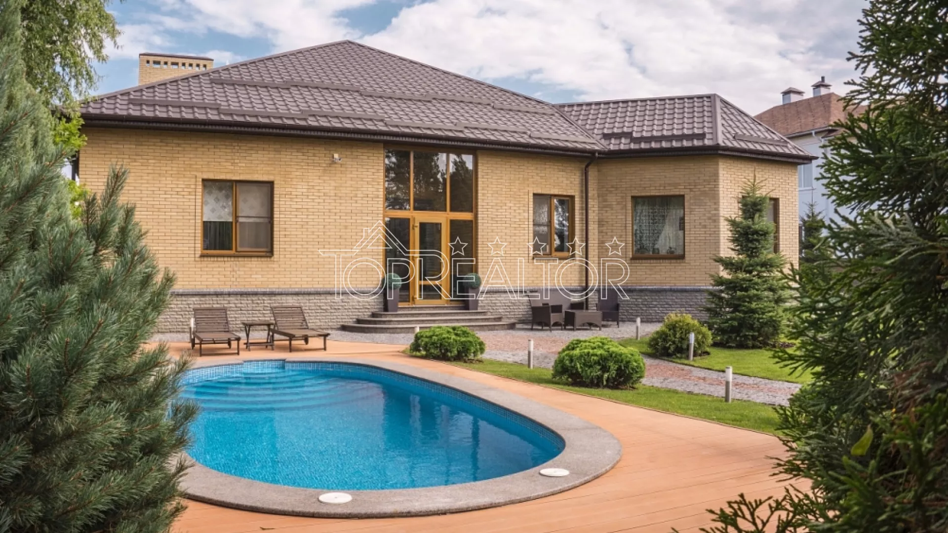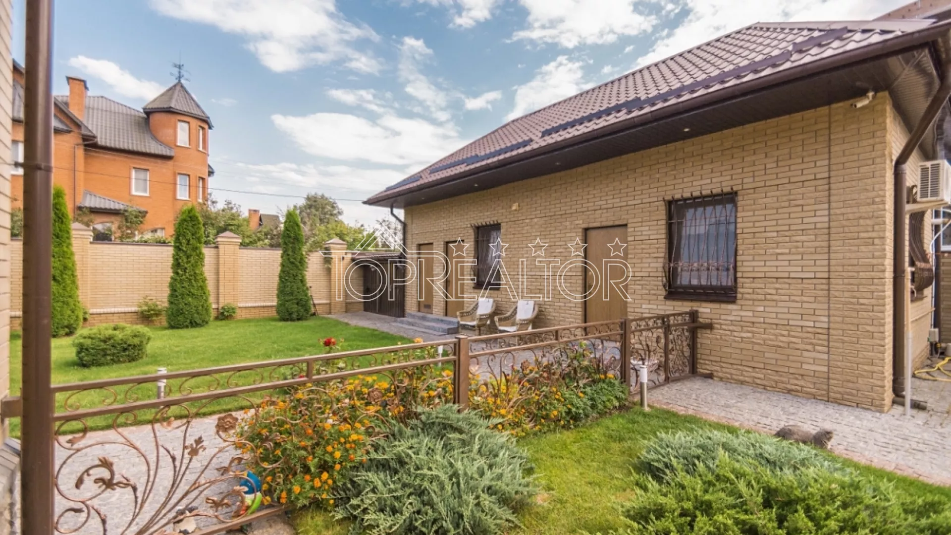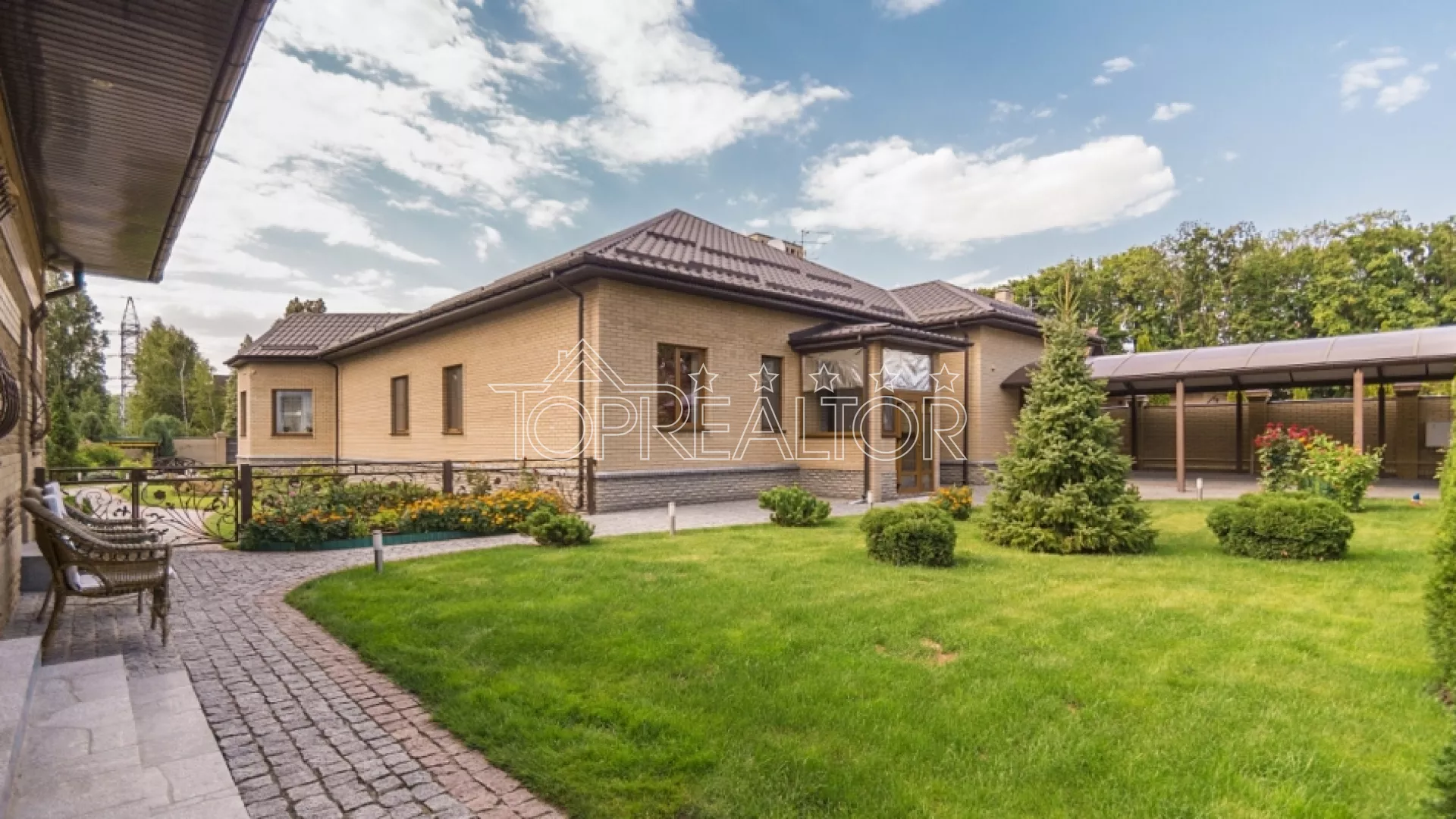 Продам новый одноэтажный коттедж, рассчитанный на проживание двух семей. В одной половине находится гостиная, 2 санузла, 3 спальни; во второй половине 2 спальни, кухня и санузел. В доме выполнен стильный высококачественный ремонт, полностью укомплектован мебелью, всей техникой, системами сигнализации и видеонаблюдением. На участке 20 соток выполнено профессиональное озеленение, смонтирован подогреваемый бассейн, работает автополив и декоративный пруд. Перед въездом в гараж есть 2 крытых паркинга на 5 авто. Также есть отдельное помещение с русской баней с комнатой отдыха и санузлом. Этот дом для тех, кто ищет современный европейский дом на две семьи с бассейном, кто ценит уют и безопасность. Продам новий одноповерховий котедж, розрахований на проживання двох сімей. В одній половині знаходиться вітальня, 2 санвузли, 3 спальні; у другій половині 2 спальні, кухня та санвузол. У будинку виконаний стильний високоякісний ремонт, повністю укомплектований меблями, всією технікою, системами сигналізації та відеоспостереженням. На ділянці 20 соток виконано професійне озеленення, змонтований басейн, що підігрівається, працює автополив і декоративний ставок. Перед в'їздом у гараж є 2 критих паркінги на 5 авто. Також є окреме приміщення з російською лазнею з кімнатою відпочинку та санвузлом. Цей будинок для тих, хто шукає сучасний європейський будинок на дві родини з басейном, хто цінує затишок та безпеку.